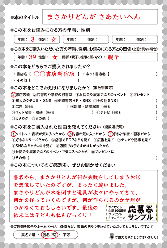 ※ハガキ内のご感想を掲載「可」とチェックいただいているものにつきましては、各種媒体で使用させていただく場合がございます。