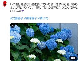 ツイッター、インスタグラム、フェイスブックで、3つのハッシュタグ「#安房直子」「#南塚直子」「#青い花」を付けて、あじさいの写真を投稿▲投稿例