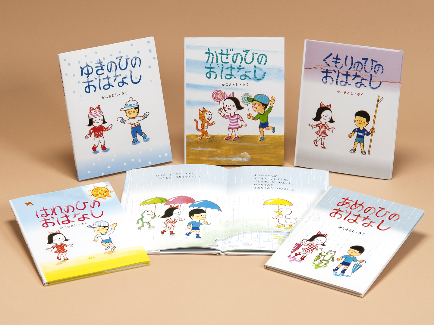 お天気をテーマにして、あめのひ、はれのひ、ゆきのひ、かぜのひ、くもりのひ、それぞれにぴったり合った遊びで、主人公のさあちゃんとゆうちゃんが楽しく遊びます。